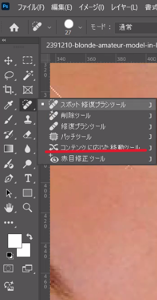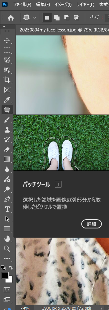 パッチツールとは、画像上の不要なものを、画像上の他の部分をパッチのように使って削除したりして画像を修復するツール。