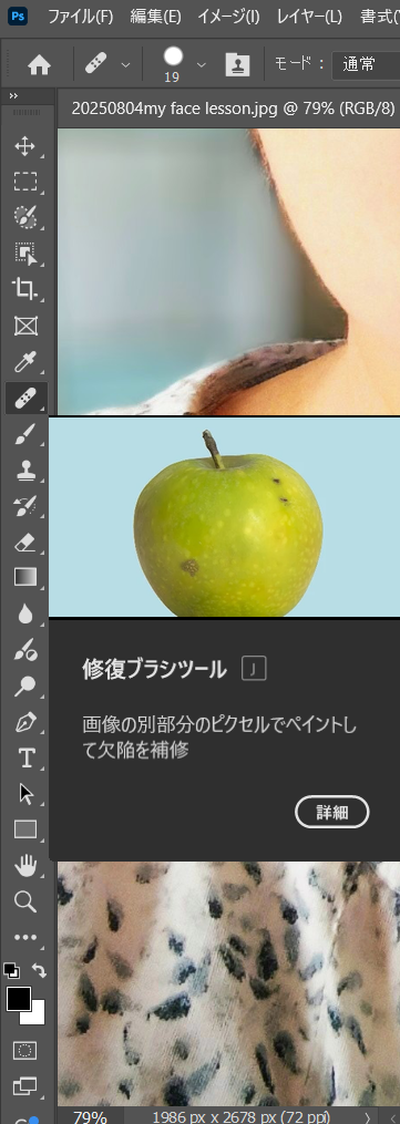 修復ブラシツールとは、修復したい箇所の上に、重ねたい画像の部分をブラシで塗り重ねるようなツール。周りの画像となじむような処理がされる。
