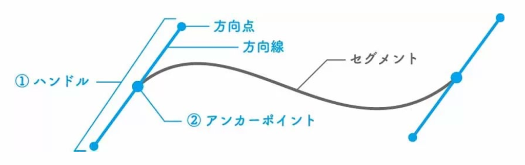 パスは「アンカーポイント」「セグメント」「ハンドル」の3つの部位からなりたっており、これら3つの部位を含んだすべてを「パス」といいます。