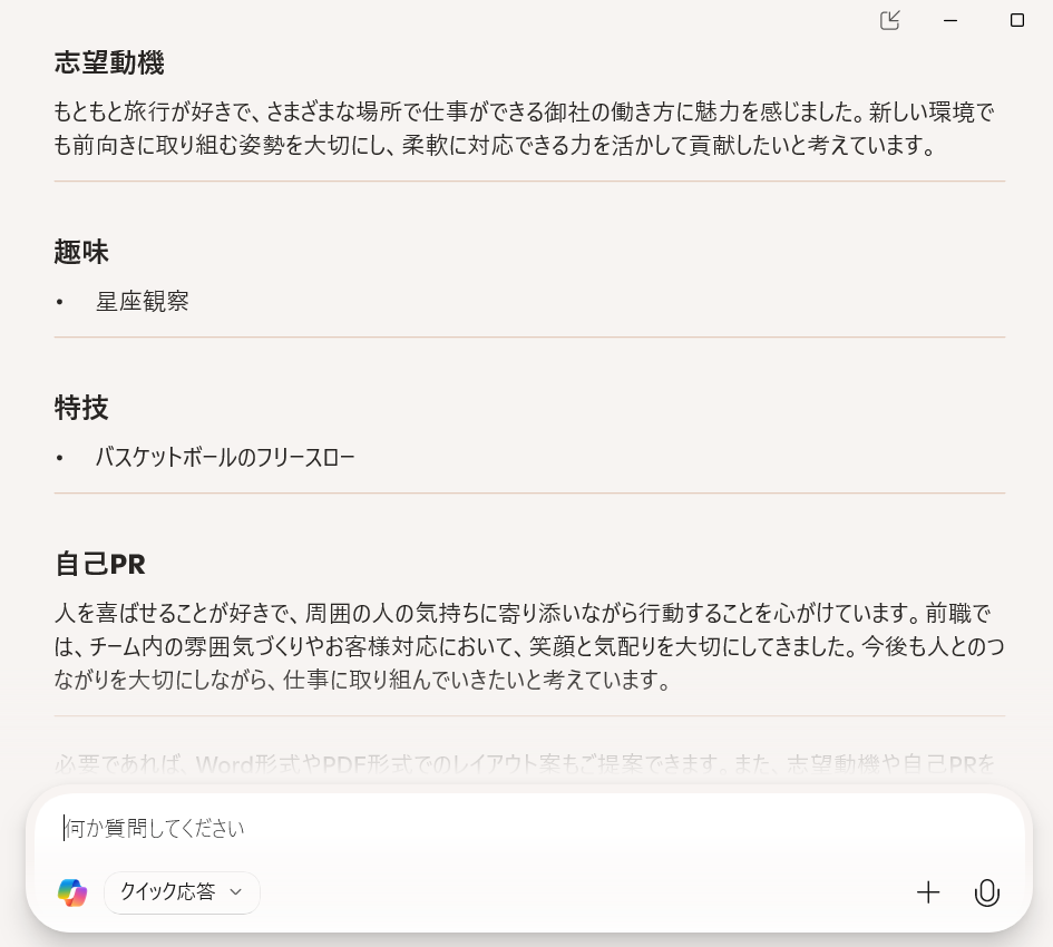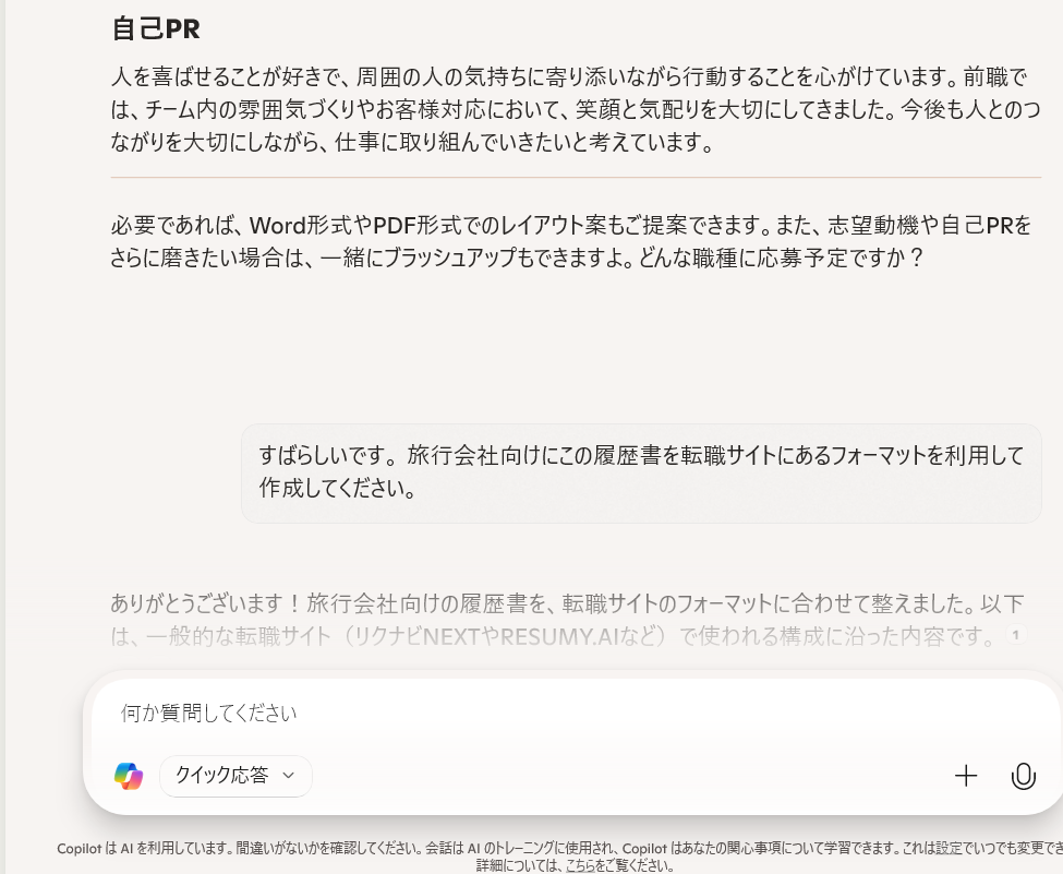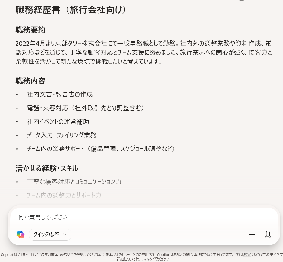 今度は簡単な職務経歴書を作ってくれました。