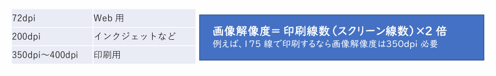 一般的印刷物の解像度は300~350dpi です。この値を基準にするとA4 は300dpi で2480px ×3508px、A1 は300dpi で7016px × 9933px となり、出力する印刷サイズから必要となる画像サイズがわかる。ただし、ポスターなどの大判のものは、手にとって見る書籍やフライヤーと異なり遠目から見るものであるので、200dpi 程度かそれ以下で制作される場合もある。また、300dpi 以上の高解像度データで印刷しても、印刷機が対応していなければ処理が重くなるだけでそれ以上キレイに印刷されない。実際の印刷物の画質は、データ上の解像度だけでなく、印刷機の性能や紙質にも依存する「線数」が影響する。