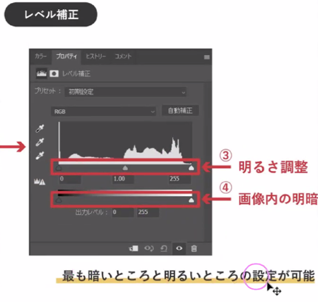 イメージとしては、写真全体の一番明るいところ(白い箇所)と一番くらいところ(黒い箇所)を設定する事で