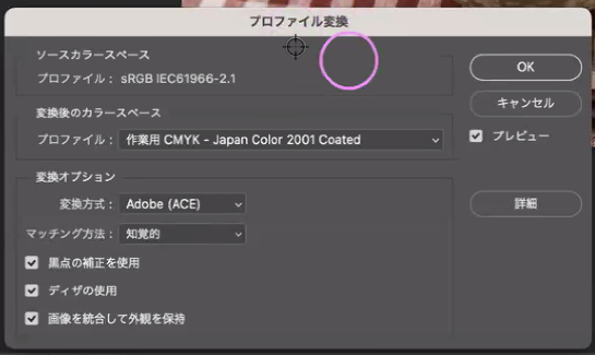 プロファイル変換でRGBからCMYKへの変換を行い別名保存する。この方法で変換すると比較的くすみが少なく変換できる。