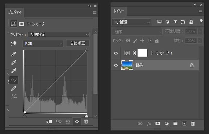 直線の対角線としてグラフに表示される。RGB 画像を調整する場合、グラフの右上の領域はハイライトを表