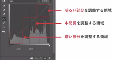 トーンカーブの補正では、画像の色調の範囲全体に配置されたポイントを補正する。画像の色調は、最初は
