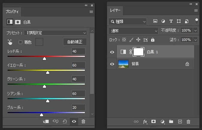 [白黒]とは、カラー画像を「白黒」画像に変換する機能。 色の系統別に詳細な設定ができるので、素材に