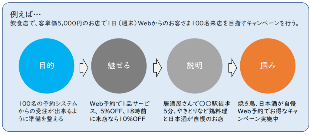 前項で「掴み」「説明」「魅せる」を軽く説明しましたがその後に、TELやメール等のお問合せや、カートシステムで購入なのか、イベントなら会場、直接対面での販売が必要なら実店舗などの最終的な「目的」が必要になる。