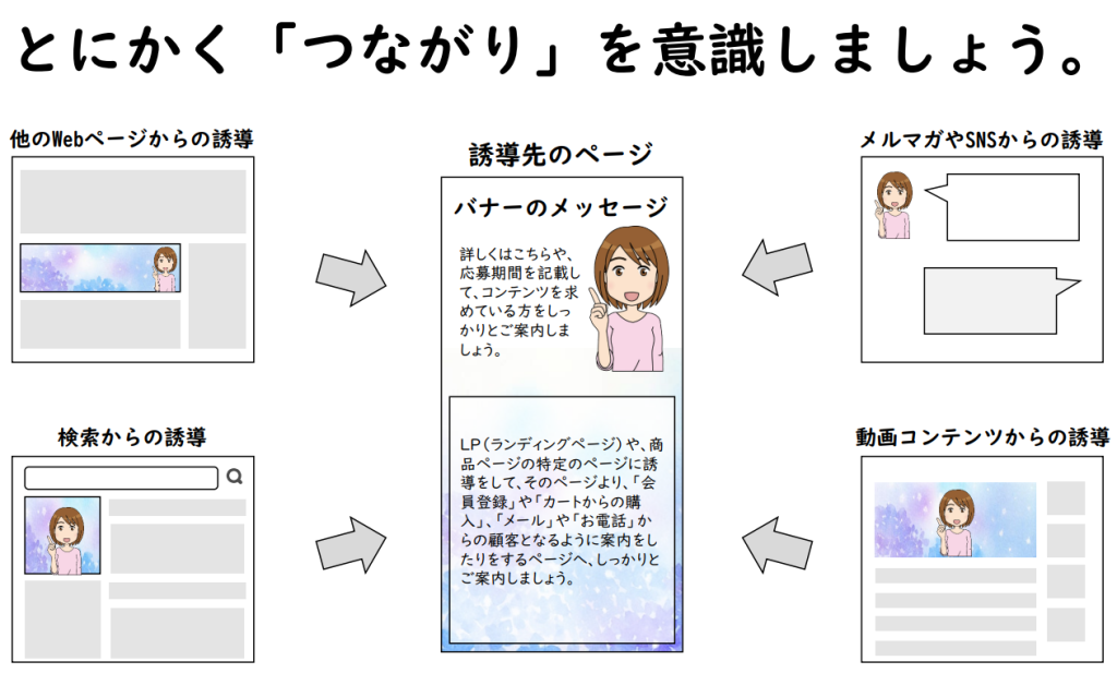 LP(ランディングページ)や、商品ページの特定のページに誘導をして、そのページより、「会員登録」や「カートからの購入」、「メール」や「お電話」からの顧客となるように案内をしたりをするページへ、しっかりとご案内しよう。