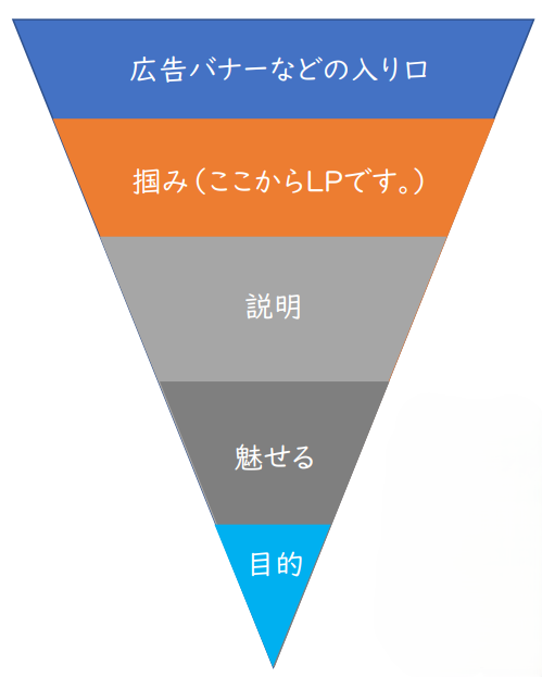 LP(ランディングページ)は、上から下にWebページを見せていく。ポイントは、上から順番に「掴んでいく」 「伝えていく」 「魅せていく」である。
